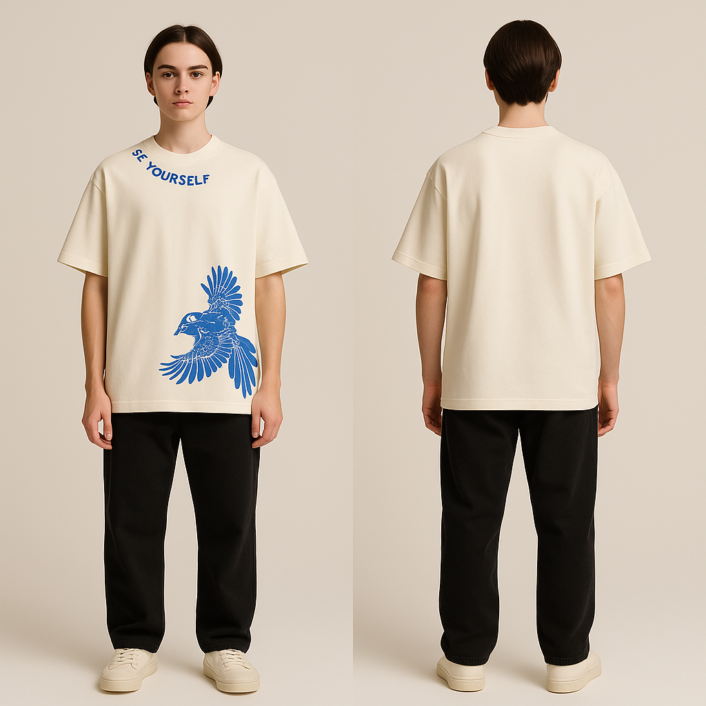 minimal oversized tee that speaks confidence — featuring a bold blue bird graphic and the words “Be Yourself” around the neck, this piece celebrates individuality and freedom in true RevealX style.