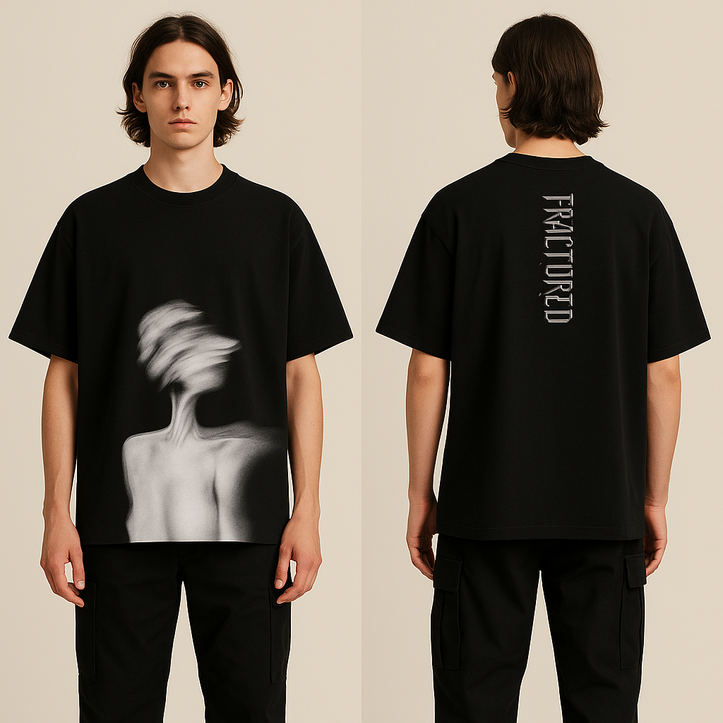 The front features a distorted grayscale figure blending into deep black — symbolizing inner turmoil and self-reflection. The back print reads “FRACTURED” in vertical gothic typography, representing power through vulnerability.